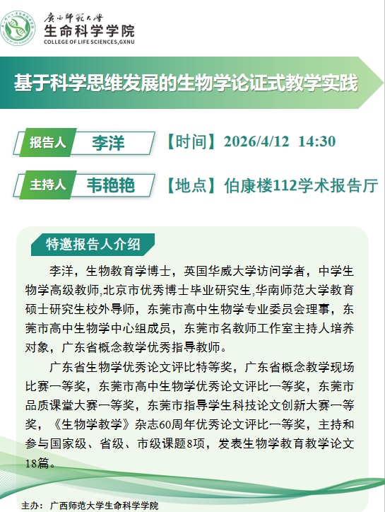 【讲座预告】生命科学学院学科素养提升论坛系列报告会第二十一讲:基于科学思维发展的生物学论证式教学实践
