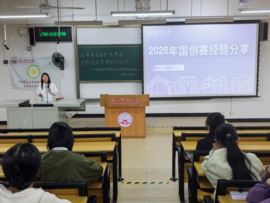 启动仪式上,学院创新创业工作负责老师深入解读了《关于举办广西师范大学中国国际大学生创新大赛(2026)暨第二十二届“创新杯”大学生创业大赛的通知》,重点强调了2026年的赛事要求和相关注意事项,还就赛事规则解析和PPT制作规范与现场同学展开了分享交流,鼓励同学们把握机遇、踊跃参与、力争突破。